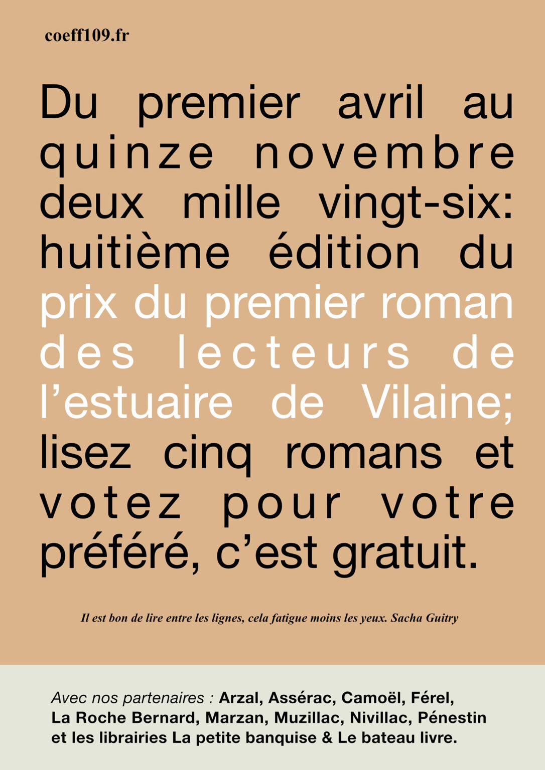 L’association Coeff109, organisme à but non lucratif engagé dans la valorisation de la création littéraire, organise tous les ans le Prix du premier roman des lecteurs de l’estuaire de la Vilaine.