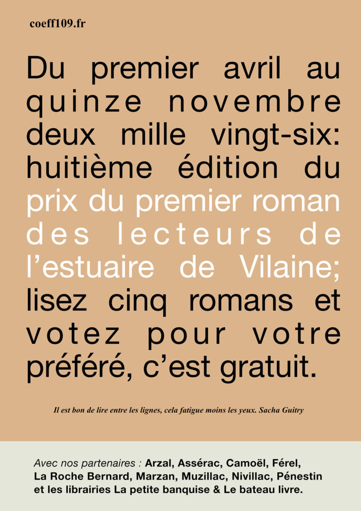 L’association Coeff109 organise la 8ème édition du prix du 1er roman des lecteurs de l’Estuaire de Vilaine. Ce prix a pour vocation de mettre en avant cinq 1ers romans francophones de genres et styles différents et d’élire ensemble votre préféré.